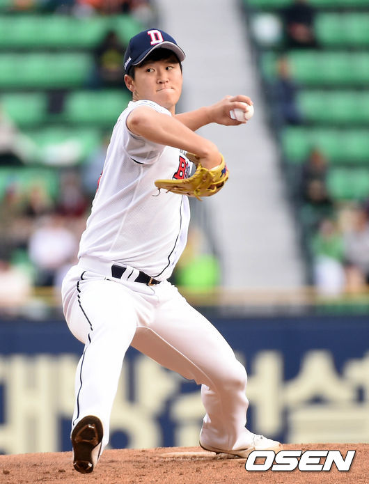 7일 오후 서울 잠실야구장에서 열린 '2015 타이어뱅크 KBO 리그' 두산 베어스와 LG 트윈스의 경기, 1회초 두산 선발 투수 진야곱이 힘차게 공을 던지고 있다.