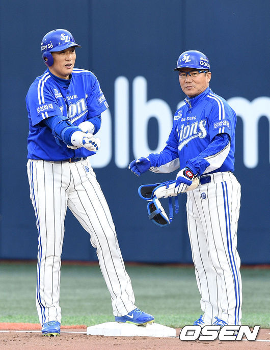 2회초 무사 1,2루에서 삼성 이승엽이 중전 적시타를 치고 타임을 외치고 있다.