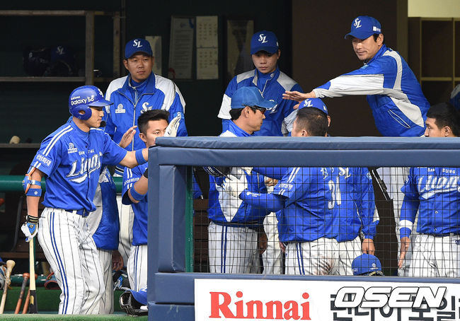 2회초 무사 1,2루에서 삼성 이승엽의 중전 적시타때 홈을 밟은 2루주자 최형우가 더그아웃에서 동료들과 하이파이브를 하고 있다.