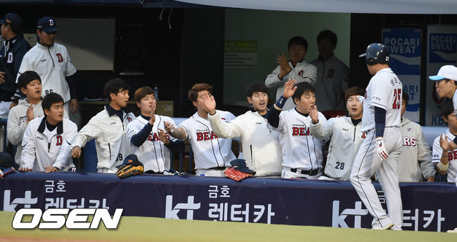 7일 오후 서울 잠실야구장에서 열린 '2015 타이어뱅크 KBO 리그' 두산 베어스와 LG 트윈스의 경기, 2회말 1사 주자 2루 두산 홍성흔의 적시타에 홈을 밟은 양의지가 더그아웃에서 기쁨을 나누고 있다.