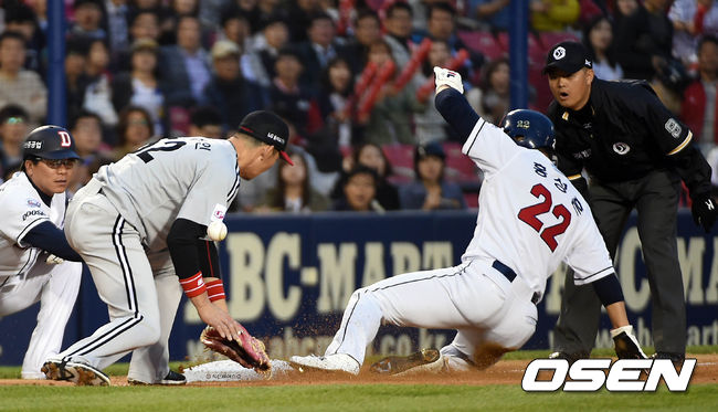 7일 오후 서울 잠실야구장에서 열린 '2015 타이어뱅크 KBO 리그' 두산 베어스와 LG 트윈스의 경기, 2회초 1사 주자 1루 두산 김재환의 안타에 1루주자 홍성흔이 3루에서 세이프되고 있다.