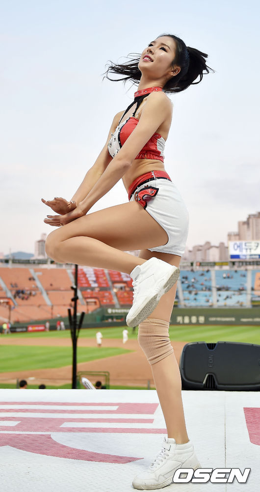 7일 오후 부산 사직구장서 열린 '2015 타이어뱅크 KBO 리그' 롯데 자이언츠와 SK 와이번스의 경기, 롯데 치어리더 박기량이 무대 위에서 화려한 공연을 펼치고 있다.