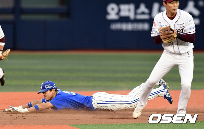 2회초 1사 1,3루에서 삼성 1루주자 박해민이 이중도루를 시도하고 있다.