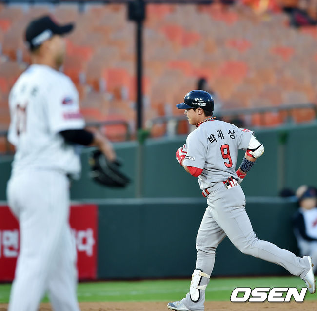 7일 오후 부산 사직구장서 열린 '2015 타이어뱅크 KBO 리그' 롯데 자이언츠와 SK 와이번스의 경기, 3회초 2사 주자 2루 SK 박재상이 선취 투런홈런을 날린 후 그라운드를 돌고 있다.