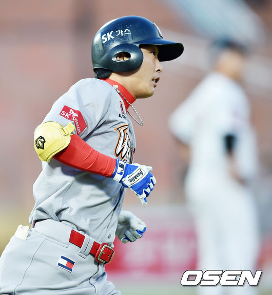 7일 오후 부산 사직구장서 열린 '2015 타이어뱅크 KBO 리그' 롯데 자이언츠와 SK 와이번스의 경기, 3회초 2사 SK 조동화가 박재상의 투런포에 이어 백투백 홈런을 날린 후 그라운드를 돌고 있다.