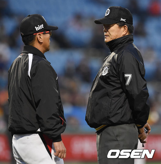 7일 오후 대전 한화생명 이글스 파크에서 열린 '2015 타이어뱅크 KBO 리그' 한화 이글스와 kt 위즈의 경기 3회말 1사 1루 정근우 타석, 엄상백의 견제 과정에서 보크 판정이나자 조범현 감독이 문승훈 1루심에게 항의를 하고 있다.
