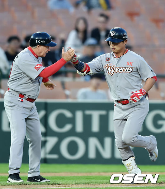 7일 오후 부산 사직구장서 열린 '2015 타이어뱅크 KBO 리그' 롯데 자이언츠와 SK 와이번스의 경기, 3회초 2사 주자 2루 SK 박재상이 선취 투런홈런을 날린 후 그라운드를 돌고 있다.