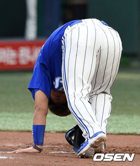 2회초 1사 1,3루에서 이중도루에 실패한 삼성 이지영이 아쉬운 표정을 짓고 있다.