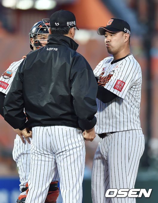 7일 오후 부산 사직구장서 열린 '2015 타이어뱅크 KBO 리그' 롯데 자이언츠와 SK 와이번스의 경기, 3회초 2사 SK 박재상에 이어 조동화에게 백투백 홈런을 맞은 롯데 송승준이 염종석 투수 코치와 얘기를 나누고 있다.