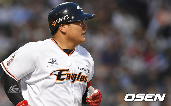 7일 오후 대전 한화생명 이글스 파크에서 열린 '2015 타이어뱅크 KBO 리그' 한화 이글스와 kt 위즈의 경기 3회말 2사 3루 김태균이 1타점 적시타를 치고 있다.