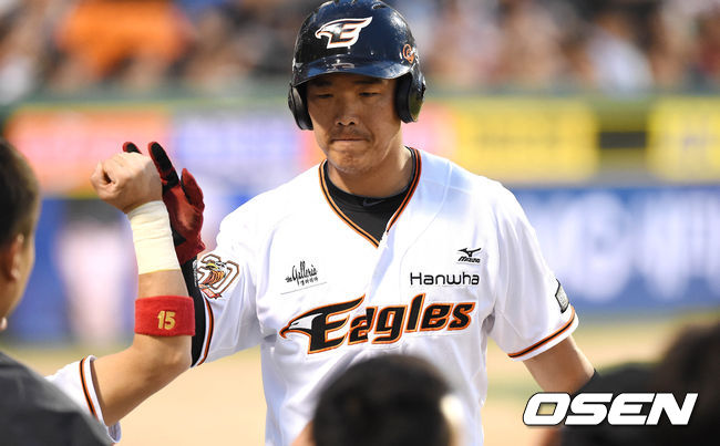 7일 오후 대전 한화생명 이글스 파크에서 열린 '2015 타이어뱅크 KBO 리그' 한화 이글스와 kt 위즈의 경기 3회말 2사 3루 김태균의 1타점 적시타에 득점한 정근우가 덕아웃에서 동료들과 하이파이브를 하고 있다.