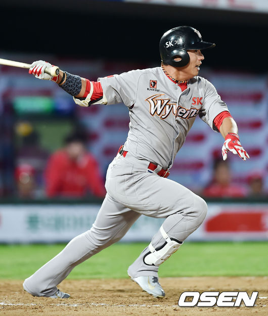 7일 오후 부산 사직구장서 열린 '2015 타이어뱅크 KBO 리그' 롯데 자이언츠와 SK 와이번스의 경기, 5회초 1사 SK 박재상이 우익수 앞 안타를 날리고 있다.