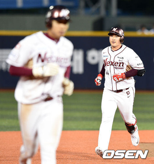 4회말 무사 1루에서 넥센 박헌도가 우월 투런 홈런을 치고 그라운드를 달리고 있다.