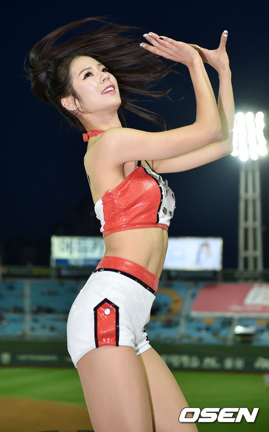 7일 오후 부산 사직구장서 열린 '2015 타이어뱅크 KBO 리그' 롯데 자이언츠와 SK 와이번스의 경기, 롯데 치어리더 박기량이 무대 위에서 화려한 공연을 펼치고 있다.