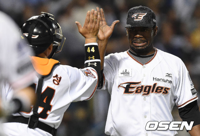 7일 오후 대전 한화생명 이글스 파크에서 열린 '2015 타이어뱅크 KBO 리그' 한화 이글스와 kt 위즈의 경기 4회초 1사 만루 유먼이 송민섭을 병살로 처리하고 조인성과 하이파이브를 하고 있다.
