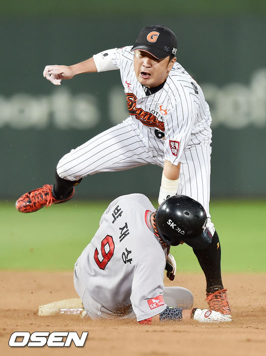 7일 오후 부산 사직구장서 열린 '2015 타이어뱅크 KBO 리그' 롯데 자이언츠와 SK 와이번스의 경기, 5회초 2사 주자 1루 SK 조동화 타석에서 1루 주자 박재상이 2루 도루를 시도했으나 롯데 문규현에게 태그아웃을 당하고 있다.