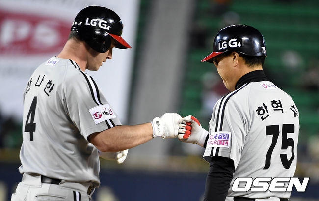 7일 오후 서울 잠실야구장에서 열린 '2015 타이어뱅크 KBO 리그' 두산 베어스와 LG 트윈스의 경기, 4회초 1사 주자 1,2루 LG 한나한이 볼넷으로 출루하고 1루 한혁수 코치와 기쁨을 나누고 있다.