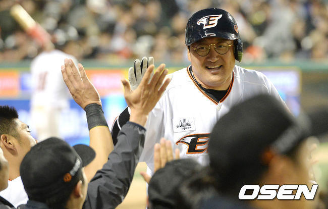 7일 오후 대전 한화생명 이글스 파크에서 열린 '2015 타이어뱅크 KBO 리그' 한화 이글스와 kt 위즈의 경기 4회말 1사 조인성이 솔로홈런을 치고 덕아웃에서 동료들과 하이파이브를 하고 있다.
