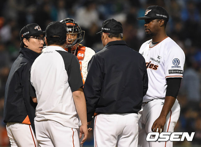 7일 오후 대전 한화생명 이글스 파크에서 열린 '2015 타이어뱅크 KBO 리그' 한화 이글스와 kt 위즈의 경기 4회초 1사 만루 니시모토 코치가 유먼에게 지시를 내리고 있다. 일본어를 쓰는 니시모토 코치는 일본어와 영어 통역을 거쳐 유먼에게 이야기를 전달하고 있다.