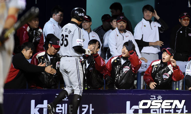 7일 오후 서울 잠실야구장에서 열린 '2015 타이어뱅크 KBO 리그' 두산 베어스와 LG 트윈스의 경기, 4회초 1사 만루 LG 최경철의 안타에 홈을 밟은 3루주자 이진영이 더그아웃에서 기쁨을 나누고 있다.