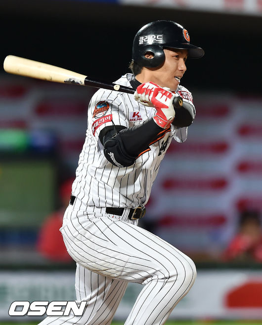 7일 오후 부산 사직구장서 열린 '2015 타이어뱅크 KBO 리그' 롯데 자이언츠와 SK 와이번스의 경기, 5회말 1사 주자 만루 롯데 김문호가 우익수 앞 1타점 적시타를 날리고 있다.