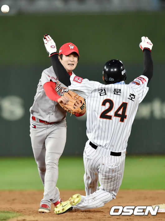 7일 오후 부산 사직구장서 열린 '2015 타이어뱅크 KBO 리그' 롯데 자이언츠와 SK 와이번스의 경기, 5회말 1사 주자 만루 롯데 문규현의 유격수 병살타때 SK 2루수 박계현이 롯데 김문호를 2루에서 포스아웃 시킨 후 1루로 송구하고 있다.