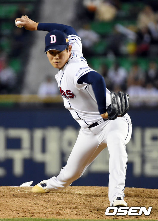 7일 오후 서울 잠실야구장에서 열린 '2015 타이어뱅크 KBO 리그' 두산 베어스와 LG 트윈스의 경기, 6회초 마운드에 오른 두산 양현이 힘차게 공을 던지고 있다.