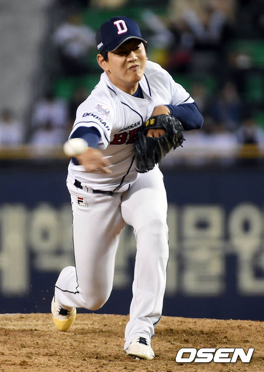 7일 오후 서울 잠실야구장에서 열린 '2015 타이어뱅크 KBO 리그' 두산 베어스와 LG 트윈스의 경기, 6회초 마운드에 오른 두산 양현이 힘차게 공을 던지고 있다.