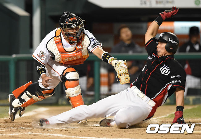 7일 오후 대전 한화생명 이글스 파크에서 열린 '2015 타이어뱅크 KBO 리그' 한화 이글스와 kt 위즈의 경기 6회초 1사 3루 용덕한의 내야안타 상황, 3루주자 박경수가 홈으로 쇄도해보지만 아웃 당하고 있다.