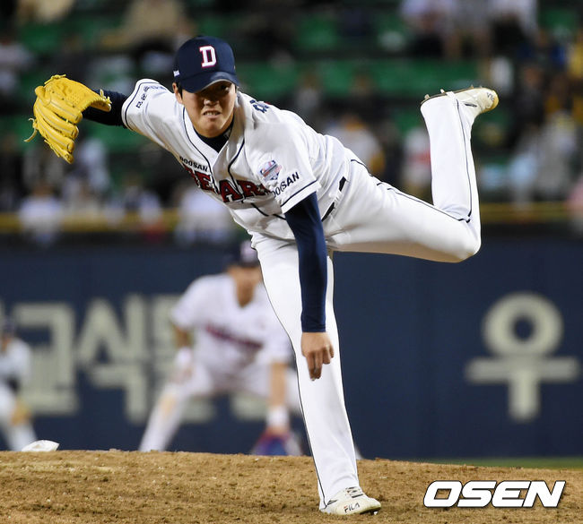 7일 오후 서울 잠실야구장에서 열린 '2015 타이어뱅크 KBO 리그' 두산 베어스와 LG 트윈스의 경기, 6회초 2사 주자 1루 마운드에 오른 두산 함덕주가 힘차게 공을 던지고 있다.