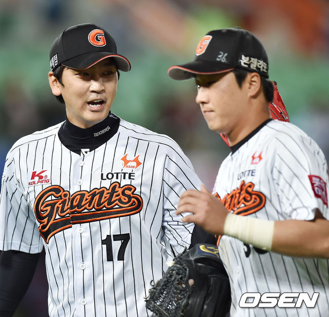 7일 오후 부산 사직구장서 열린 '2015 타이어뱅크 KBO 리그' 롯데 자이언츠와 SK 와이번스의 경기, 9회초를 마무리한 롯데 심수창이 동료들과 하이파이브를 나누고 있다.