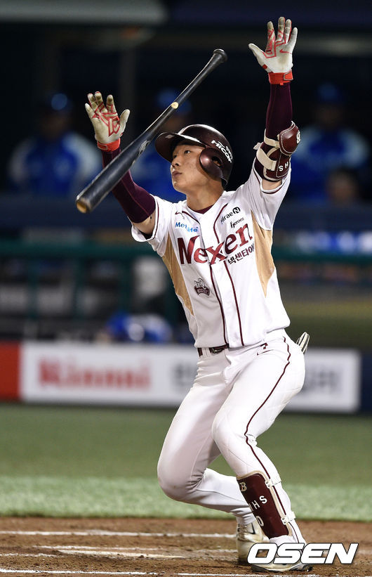 7회말 무사에서 넥센 김하성이 좌월 솔로 홈런을 치고 있다.