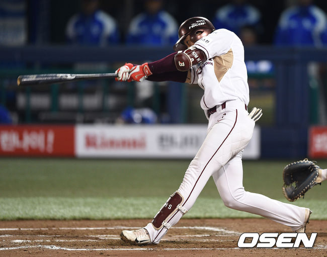 7회말 무사에서 넥센 김하성이 좌월 솔로 홈런을 치고 있다.