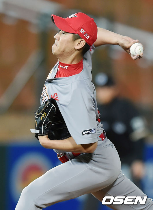 7일 오후 부산 사직구장서 열린 '2015 타이어뱅크 KBO 리그' 롯데 자이언츠와 SK 와이번스의 경기, 9회말 SK 윤길현이 힘차게 공을 뿌리고 있다.