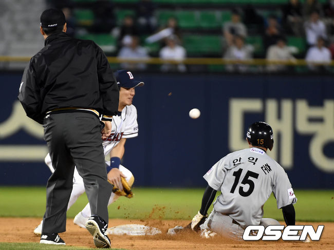 7일 오후 서울 잠실야구장에서 열린 '2015 타이어뱅크 KBO 리그' 두산 베어스와 LG 트윈스의 경기, 7회초 1사 주자 1루 LG 안익훈이 도루에 성공하고 있다.