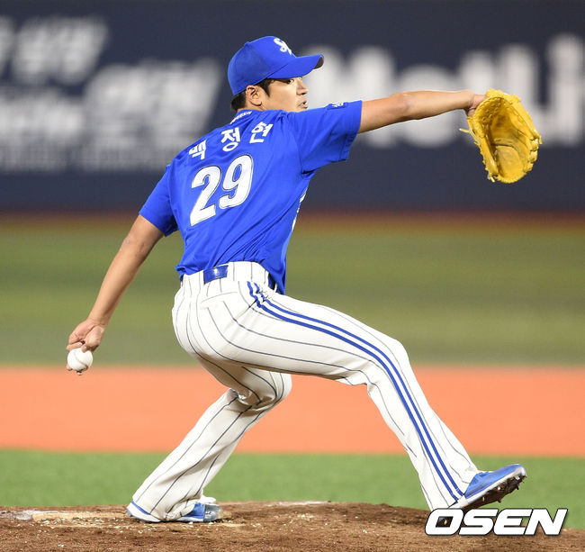 7회말 삼성 백정현이 힘차게 공을 던지고 있다.