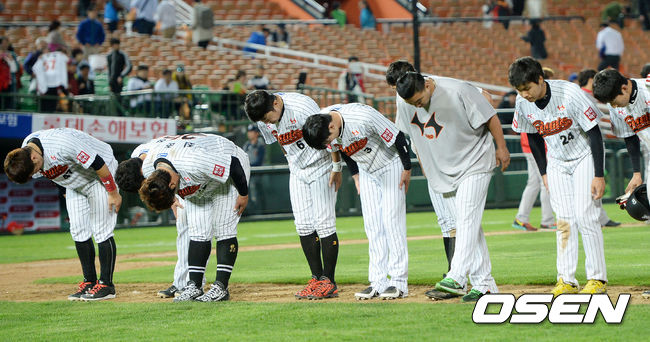 경기를 마치고 롯데 선수들이 고개 숙여 인사하고 있다. / rumi@osen.co.kr