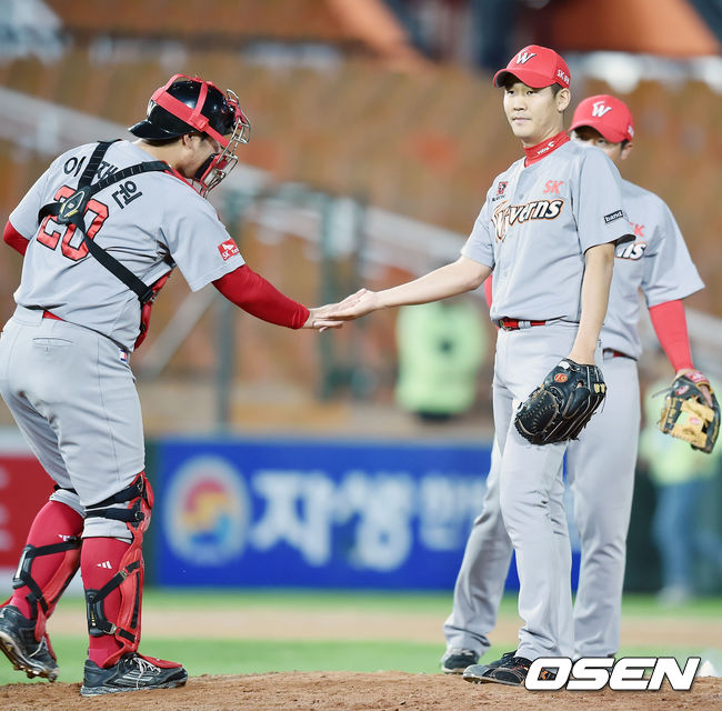 경기를 마치고 SK 윤길현이 이재원과 하이파이브를 하고 있다. / rumi@osen.co.kr