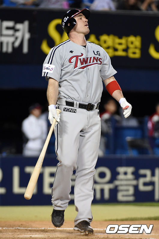 7일 오후 서울 잠실야구장에서 열린 '2015 타이어뱅크 KBO 리그' 두산 베어스와 LG 트윈스의 경기, 7회말 LG 한나한이 헛스윙 삼진을 당하고 있다.