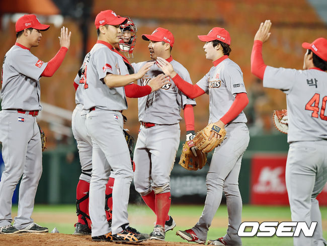 경기를 마치고 SK 선수들이 마운드 근처에서 하이파이브를 하고 있다. / rumi@osen.co.kr