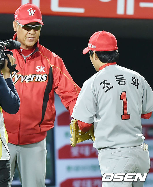 경기를 마치고 김용희 감독이 조동화와 하이파이브를 하고 있다. / rumi@osen.co.kr