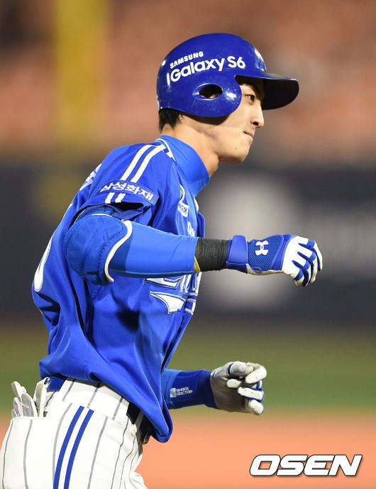 8회초 2사 1루에서 삼성 구자욱이 투런 홈런을 치고 그라운드를 달리고 있다.
