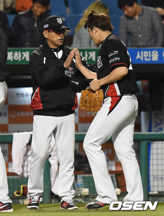 7일 오후 대전 한화생명 이글스 파크에서 열린 '2015 타이어뱅크 KBO 리그' 한화 이글스와 kt 위즈의 경기 종료 후 조범현 감독과 장시환이 하이파이브를 하고 있다.