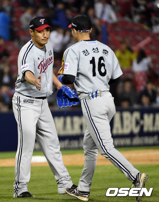 7일 오후 서울 잠실야구장에서 열린 '2015 타이어뱅크 KBO 리그' 두산 베어스와 LG 트윈스의 경기, 10회말 이닝종료후 LG 투수 이동현이 1루수 정성훈과 기쁨을 나누고 있다.