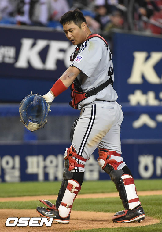 7일 오후 서울 잠실야구장에서 열린 '2015 타이어뱅크 KBO 리그' 두산 베어스와 LG 트윈스의 경기, 연장 10회말 LG 최경철이 두산 양의지의 파울볼을 처리하고 자리로 돌아가고 있다.