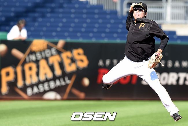 8일(한국시간) 미국 펜실베니아주 PNC 파크에서 열리는 '2015 메이저리그' 피츠버그 파이어리츠와 신시내티 레즈의 경기를 앞두고, 피츠버그 강정호가 수비 훈련을 하고 있다.