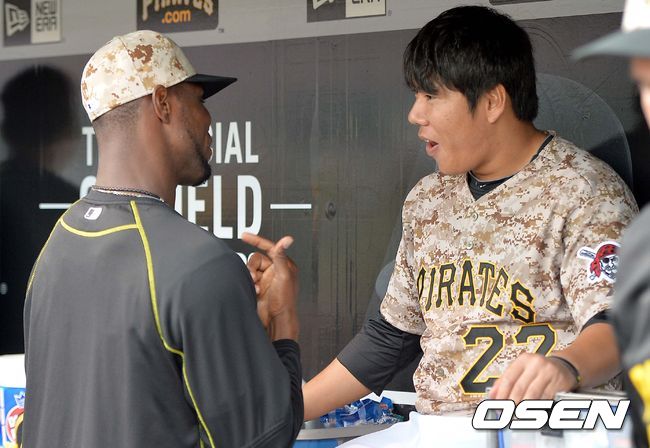8일(한국시간) 미국 펜실베니아주 PNC 파크에서 '2015 메이저리그' 피츠버그 파이어리츠와 신시내티 레즈의 경기가 열렸다. 밀리터리 유니폼을 입은 피츠버그 강정호가 투수 리즈와 대화를 나누고 있다.