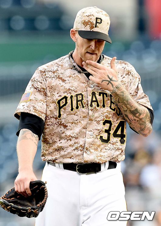 8일(한국시간) 미국 펜실베니아주 PNC 파크에서 '2015 메이저리그' 피츠버그 파이어리츠와 신시내티 레즈의 경기가 열렸다. 밀리터리 유니폼을 입은 피츠버그 선발 A.J. 버넷이 1회를 막아낸 뒤 더그아웃으로 향하고 있다.