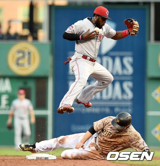 8일(한국시간) 미국 펜실베니아주 PNC 파크에서 '2015 메이저리그' 피츠버그 파이어리츠와 신시내티 레즈의 경기가 열렸다. 3회말 피츠버그 공격 1사 1루 상황 매커친의 땅볼 타구 때 신시내티 2루수 브랜든 필립스가 주자 닐 워커를 포스아웃 시킬 때 점프하며 피하고 있다.