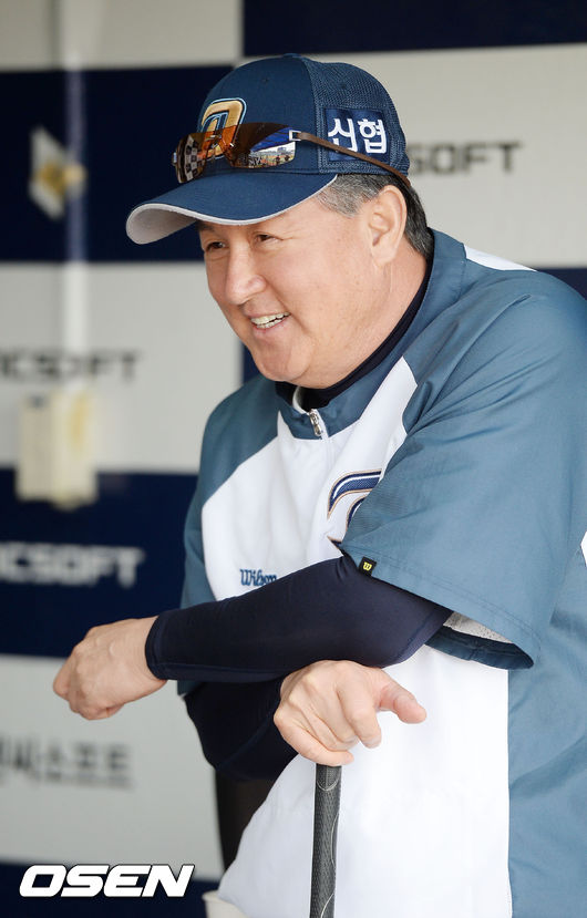 8일 오후 창원시 마산 야구장서 '2015 타이어뱅크 KBO 리그' NC 다이노스와 롯데 자이언츠의 경기가 열릴 예정인 가운데, 양팀 훈련시간에 NC 김경문 감독이 덕아웃에서 환하게 미소짓고 있다.